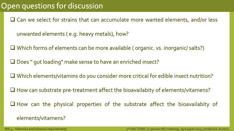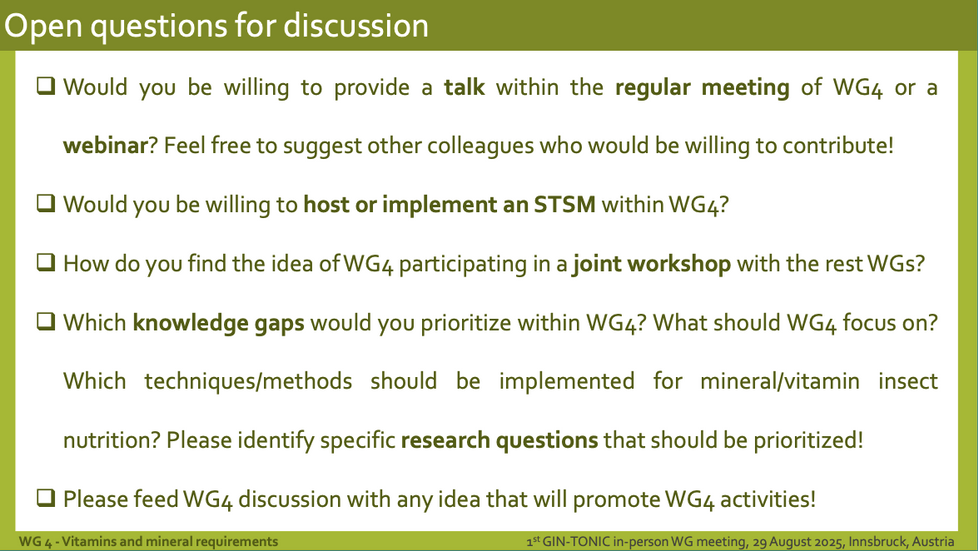 The Innsbruck meeting underscored a shared commitment to knowledge exchange and collaboration. From molecular biology to applied nutrition and standardization approached, each Working Group contributes to building a holistic framework for understanding insect nutritional needs and enhancing sustainability in insect farming.
